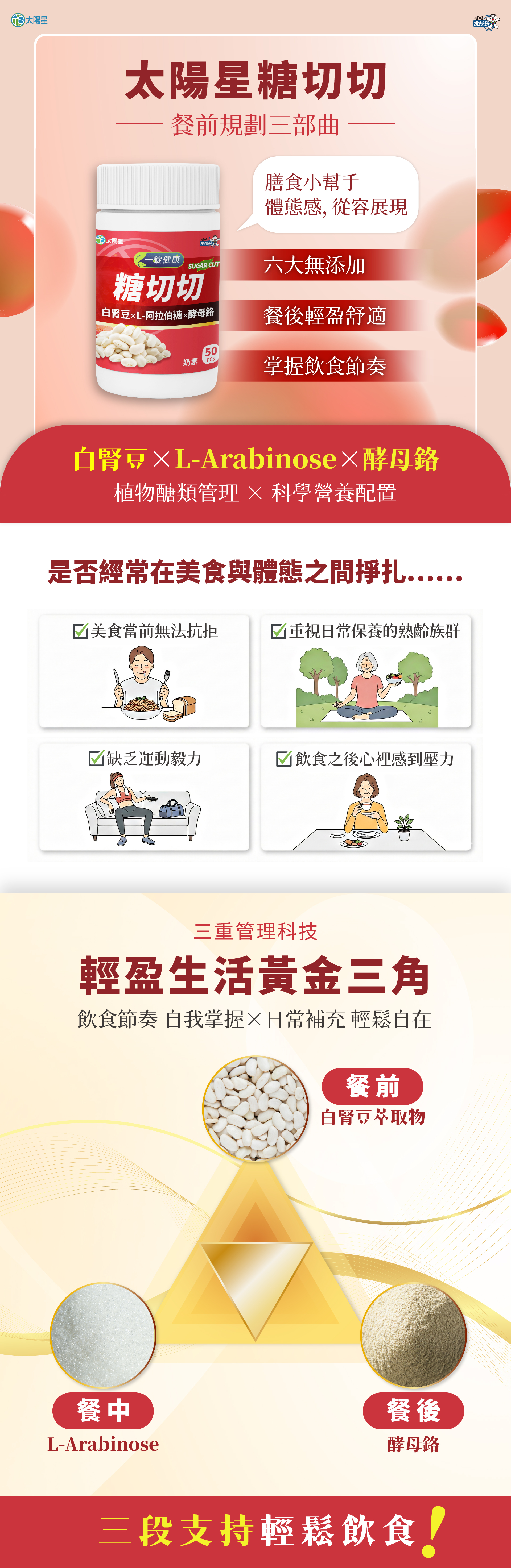 ☆輕盈生活黃金三角:餐前白腎豆萃取物、餐中L-Arabinose、餐後酵母鉻
